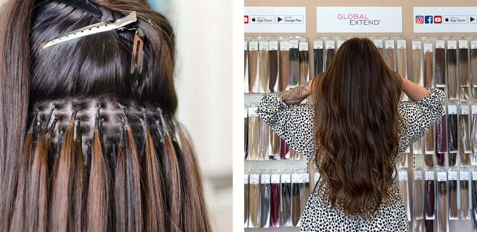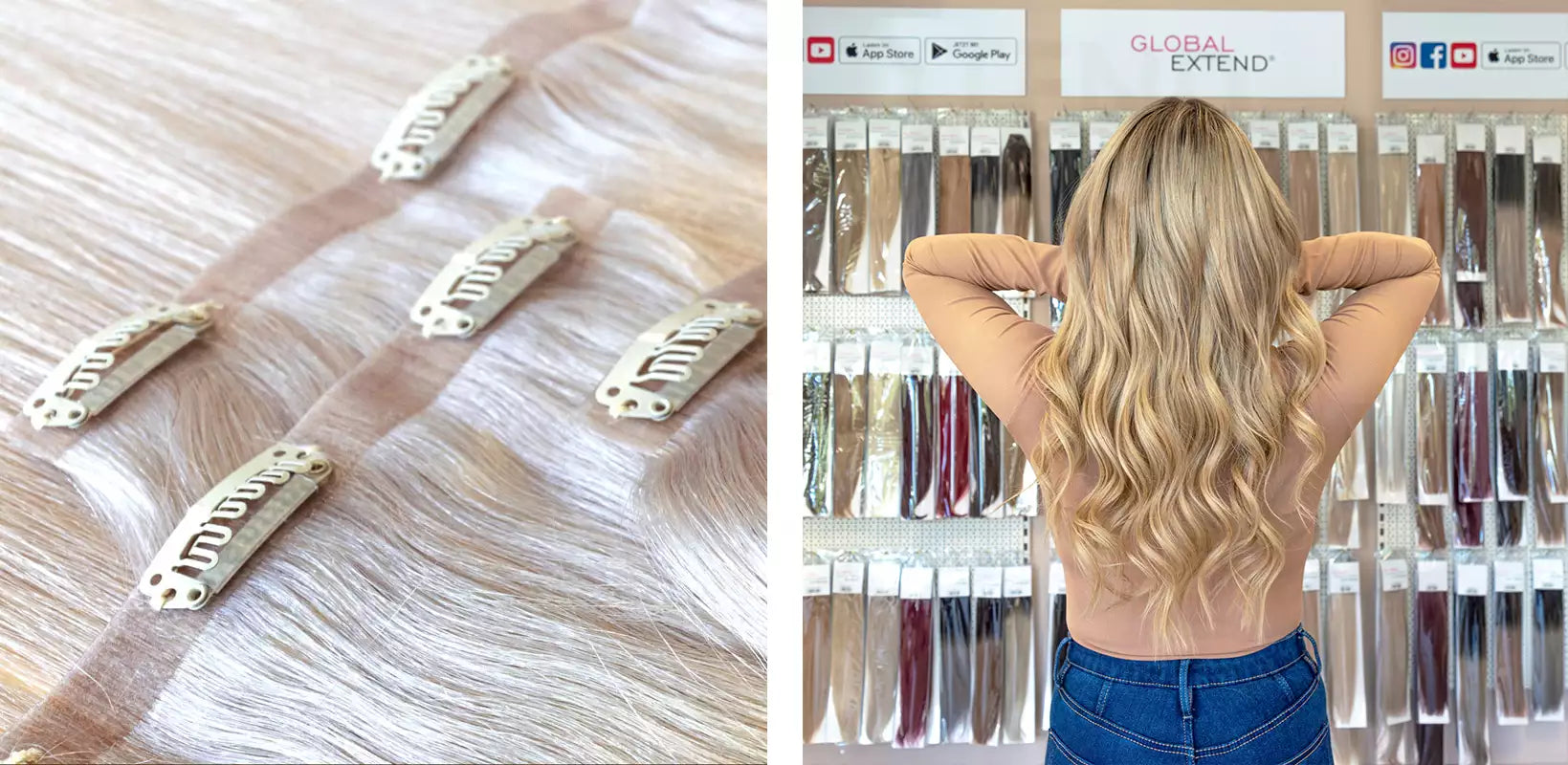 Clip-in extensions, ponytail extensions, keratin bond extensions, hair wefts, tape-in extensions, invisible tape-ins, nano ring extensions, top hairpieces, hair care products