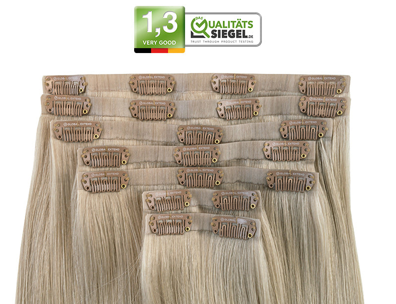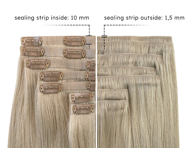 With invisible clip-in extensions, you can add volume and length to your hair in no time. Thanks to the special sealing strip, which does not use any threads, a weft contains almost twice as much hair volume as a classic clip-in weft. The extensions sit flat and comfortably thanks to the special seam. Thanks to the luxurious volume, one set is sufficient for a complete hair extension, even with thick natural hair. The hair is full right down to the tips. The seamless clip-in extensions are available in four different lengths: 30 cm/12" (120 grams), 40 cm/16" (150 grams), 50 cm/20" (190 grams) and 60 cm/24" (240 grams).
